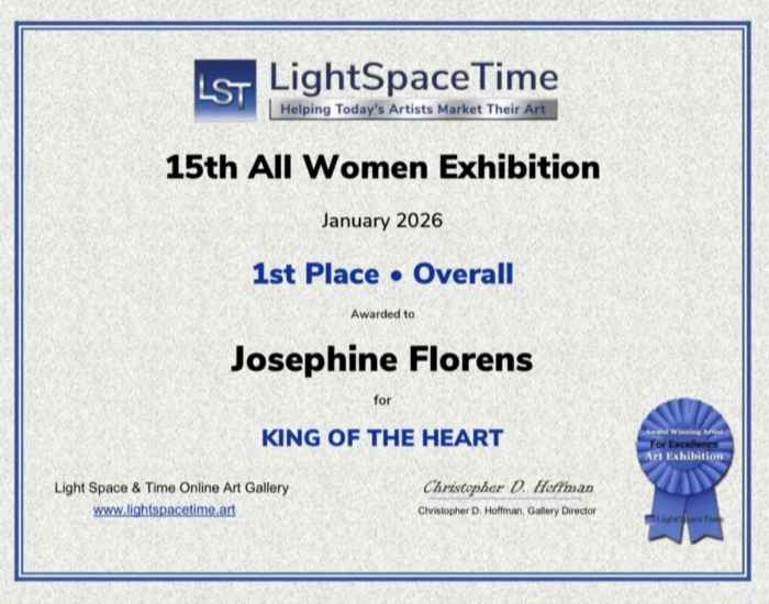 Despite the profound disruptions of recent years, Florens has remained deeply committed to her artistic practice. She has actively participated in international competitions, curated exhibitions, and collaborative projects, while continuing to develop long-term painting series. Her works have been featured in international publications and juried selections, and she has also served as a juror for international art competitions, contributing her expertise to the evaluation of contemporary artistic practices.